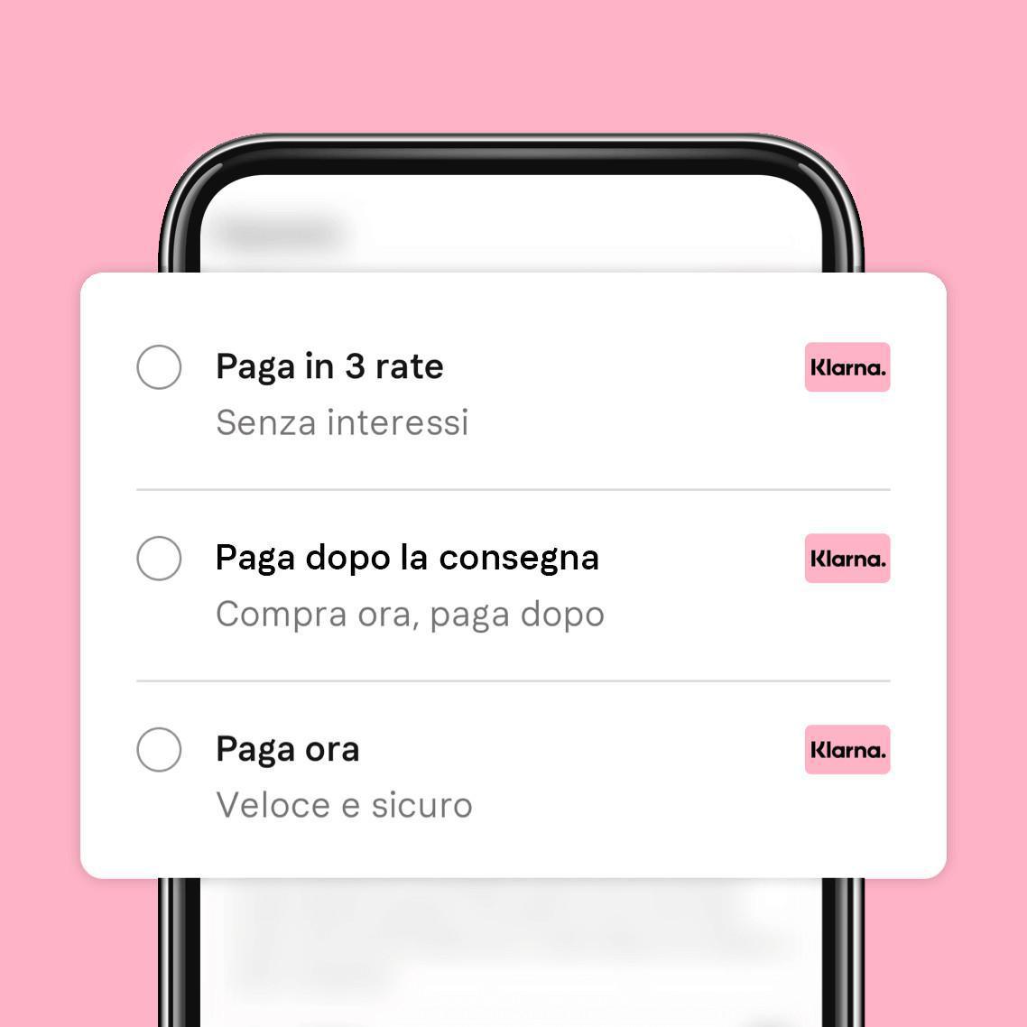 Klarna è un innovativo metodo di pagamento che permette al cliente di acquistare nei negozi online e In Store, ricevere immediatamente i prodotti e pagare a rate con scadenza mensile.